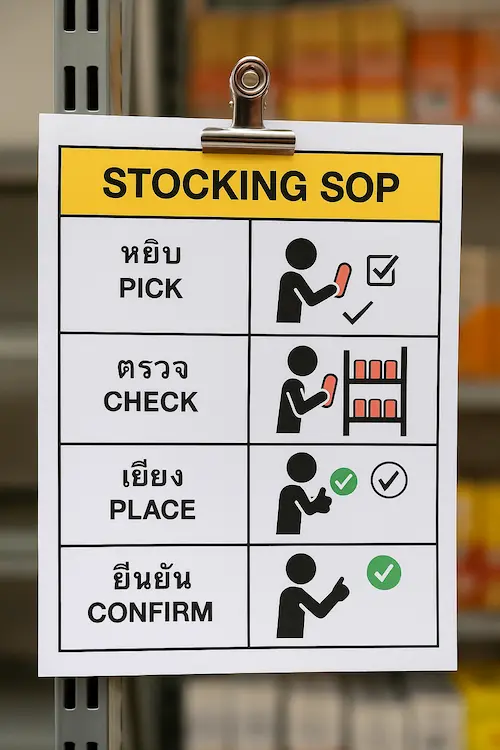 - Use pictures + short verbs: “Pick → Scan → Place → Confirm”.